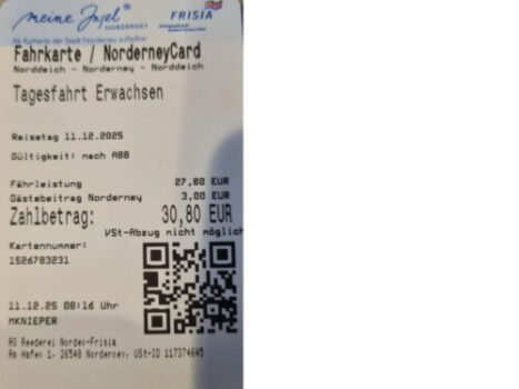 Am zweiten Tag bin ich dann ganz früh aufgestanden, um den Ausflug nach Norderney möglichst zeitig zu beginnen. Erst 45 Minuten zu Fuß zur Fähre, Ticket besorgt und dann mit der 8:30 Fähre nach Norderney gefahren. Die Überfahrt dauerte auch ca. 45 Minuten. Ich wollte möglichst früh dort sein, um viel von dem Tag an der frischen Nordseeluft zu verbringen. Das Klima auf den Inseln soll noch besser für Atemwegserkrankungen sein als an der Küste. Sicher ein Tag ist nicht viel und wird auch nicht lange Nachwirken, trotzdem wollte ich so viel es geht „mitnehmen“.
