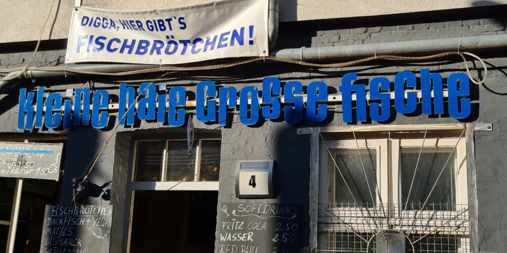 Von den Landungsbrücken sind wir dann Richtung Stadt hochgegangen. Dabei konnten wir noch einmal einen Blick auf die Landungsbrücken werfen. Nachdem wir oben waren, haben wir uns erstmal ein Fischbrötchen gegönnt.