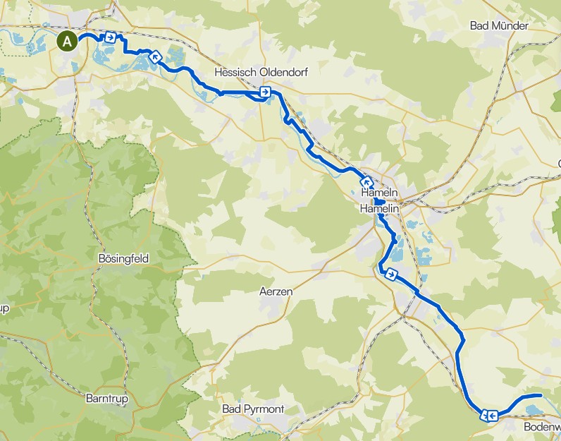 Die erste Fahrradtour von Rinteln aus, ging Richtung Hameln, der Rattenfängerstadt. Ich habe mir die Stadt mit dem Fahrrad angesehen. Anschließend bin ich noch weiter auf dem Weserradweg Flussaufwärts gefahren, bis kurz vor Bodenwerder. Da ich die ganze Strecke auch wieder zurück musste, habe ich dann irgendwann abgebrochen. Man muss ja nicht übertreiben.