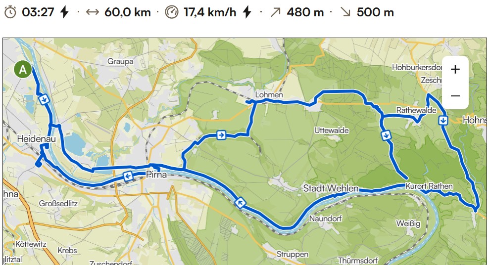 Steigungen bis zu 15% gab es zwar, allerdings nur auf kurzen Abschnitten – die meiste Strecke war moderater. In Lohmen hatte ich die Beschilderung mal wieder einmal falsch interpretiert und dadurch einen Umweg eingebaut.